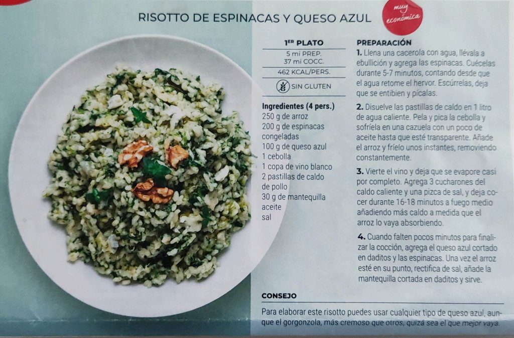 Este verano vi en una revista esta rica receta de Risotto de espinacas y queso azul que pensé que sería interesante realizar. La guardé y hace unos días la hice con el robot de cocina Monsieur Cuisine. No me ha defraudado, ha quedado buenísima y quiero compartirla.