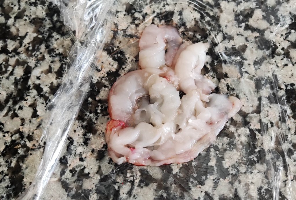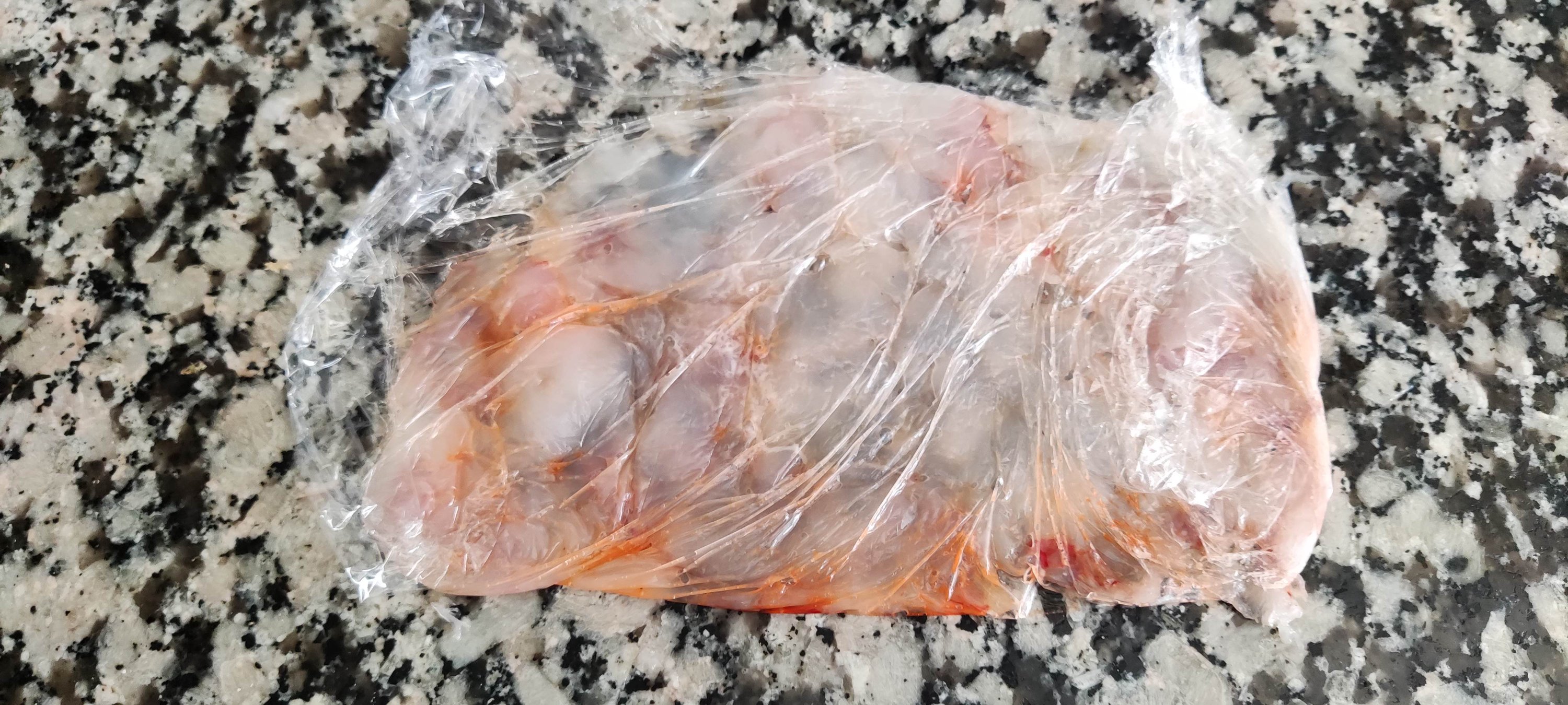 3 o 4 Gambas las cortamos a taquitos y reservamos. Las otras gambas las partimos longitunalmente y las colocamos entre papel film con unas gotas de aceite.