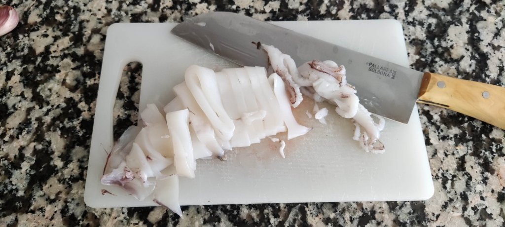 Cortamos el calamar a rodajas y lo salteamos en un poco de aceite en una cazuela.