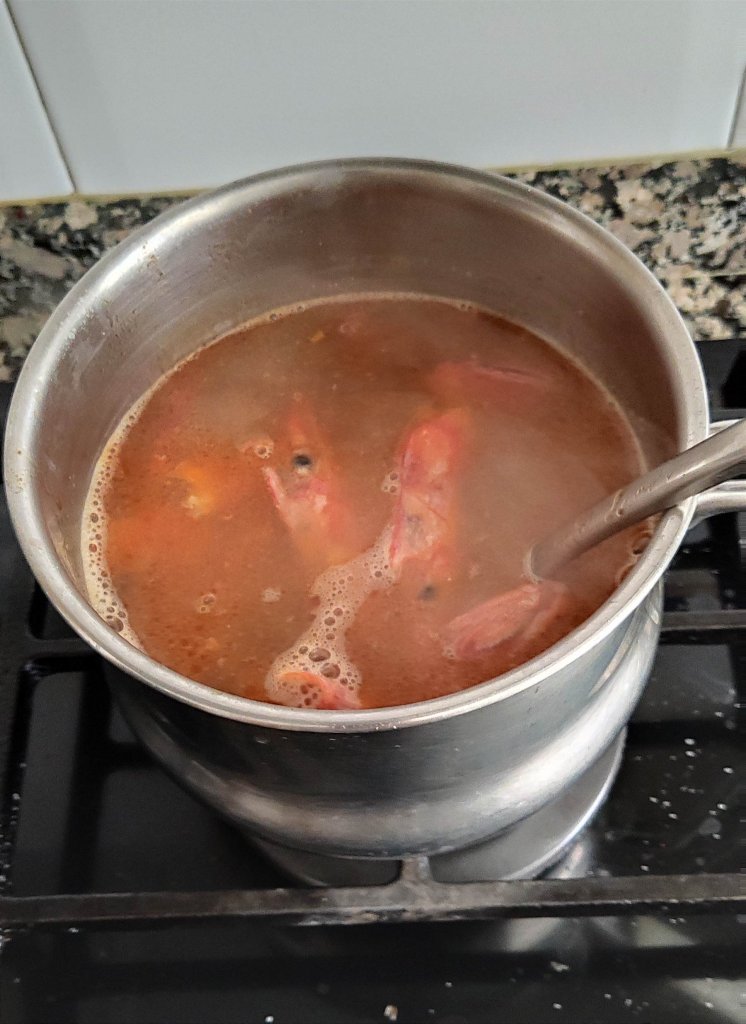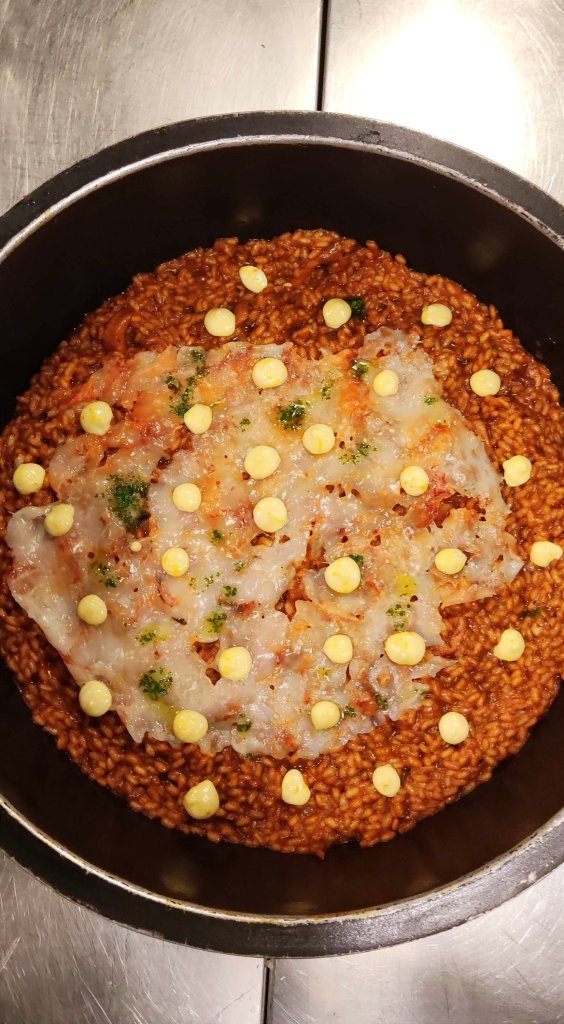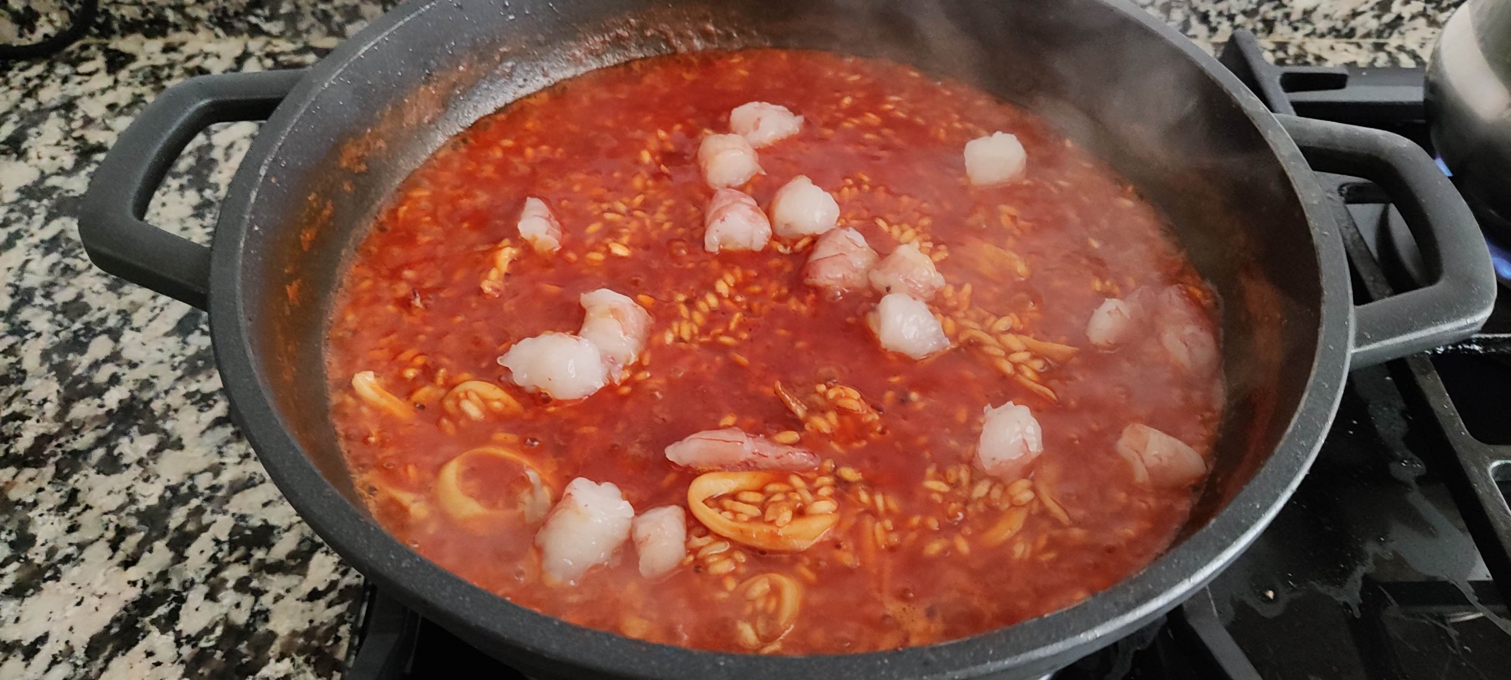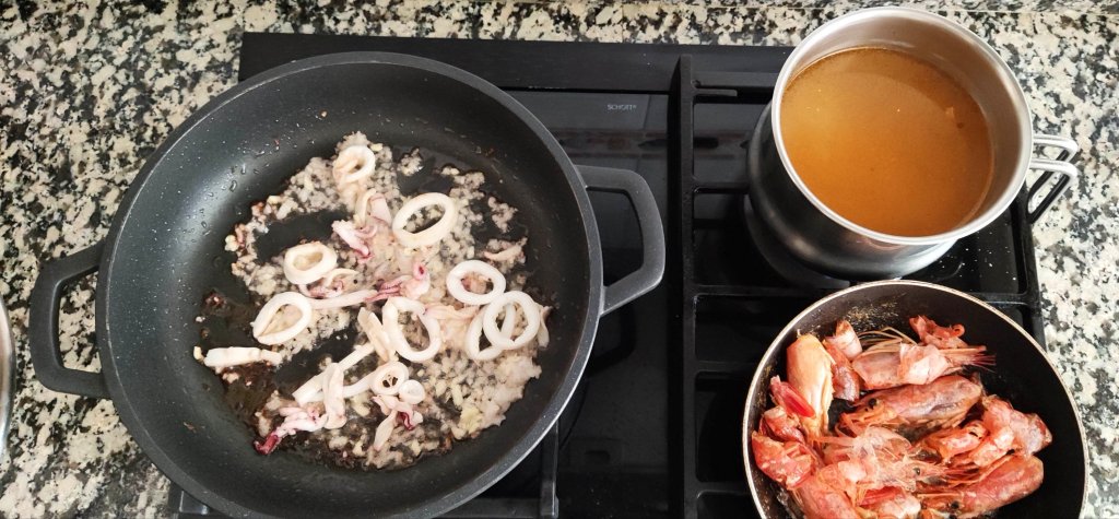 A continuación, vamos añadiendo el caldo de pescado que tendremos calentando en otro fuego. Hacemos esto de cucharón en cucharón hasta que se quede seco cada vez. Se prepara a modo risotto. Tiempo estimado unos 15 minutos.