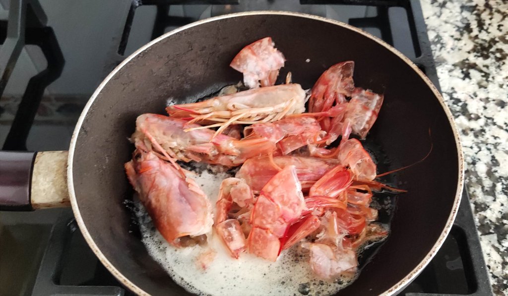 Vamos removiendo las pieles de las gambas que tenemos en la sarten.