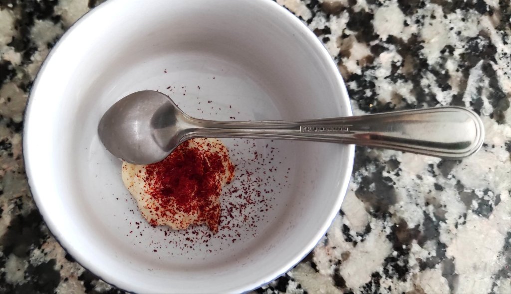 En un poco de mayonesa mezclamos unos hebras o polvo de azafrán . Repartimos pequeños puntitos por encima del arroz y el resto lo reservamos por si algún comensal quiere añadirse más tarde.