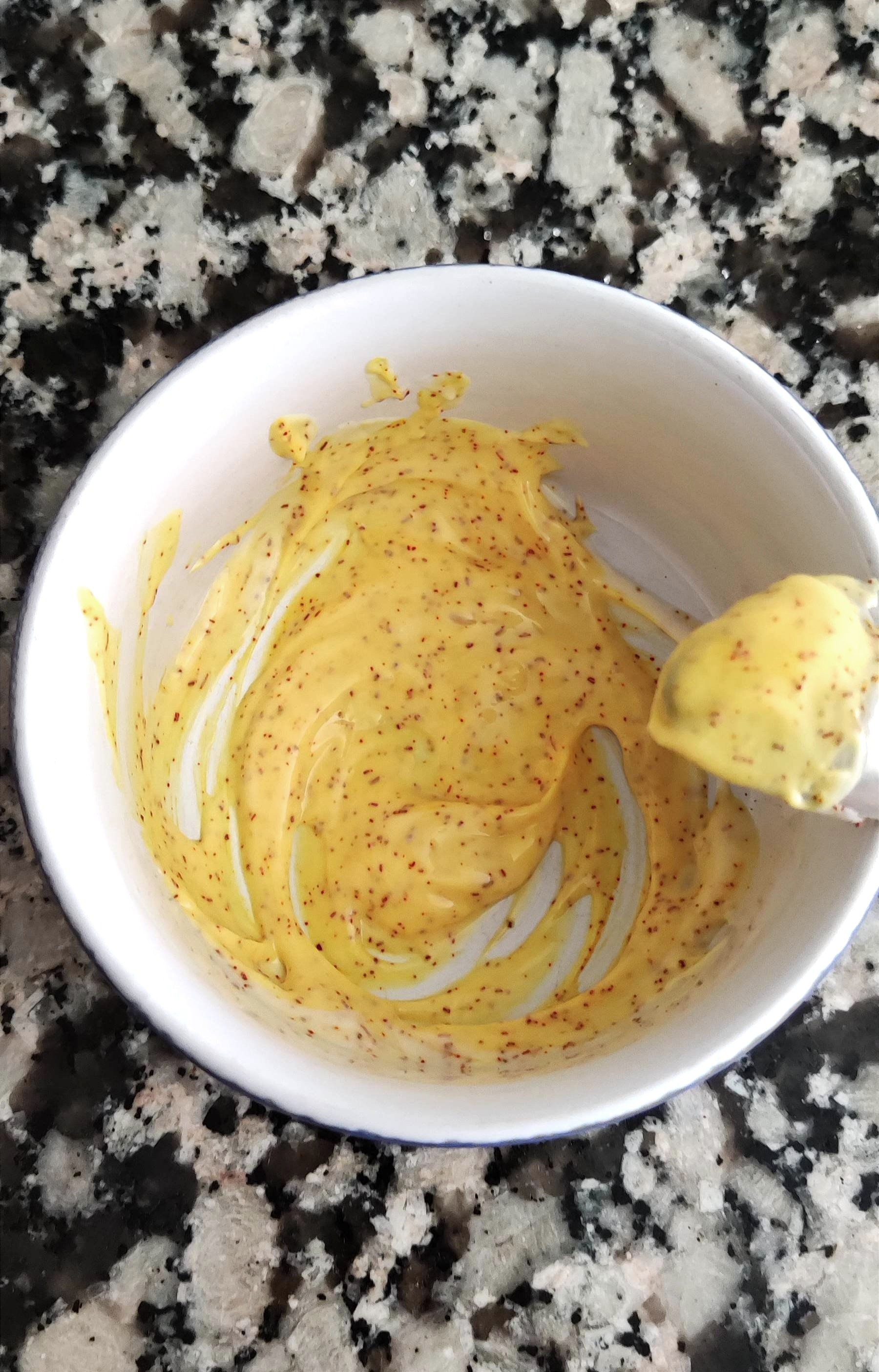 Para adornar el arroz meloso preparamos una mayonesa de azafrán.
