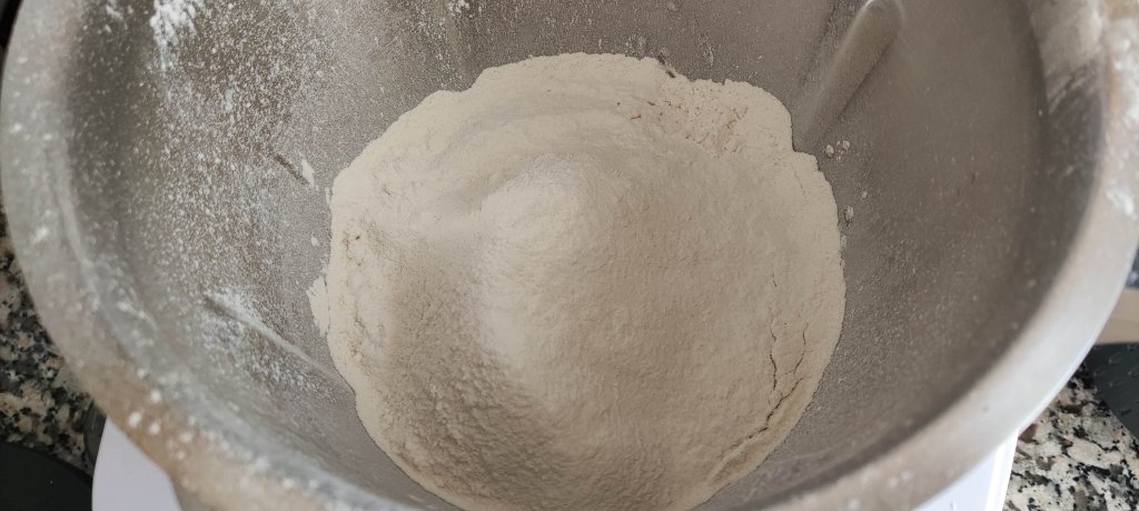 Programa 30 segundos velocidad 4. Abre la tapa y con la ayuda de la espátula baja los restos de harina para volver a programar 30 segundos velocidad 4. Si ves que no ha mezclado bien, vuelve a bajar la mezcla y dale 20 segundos más.