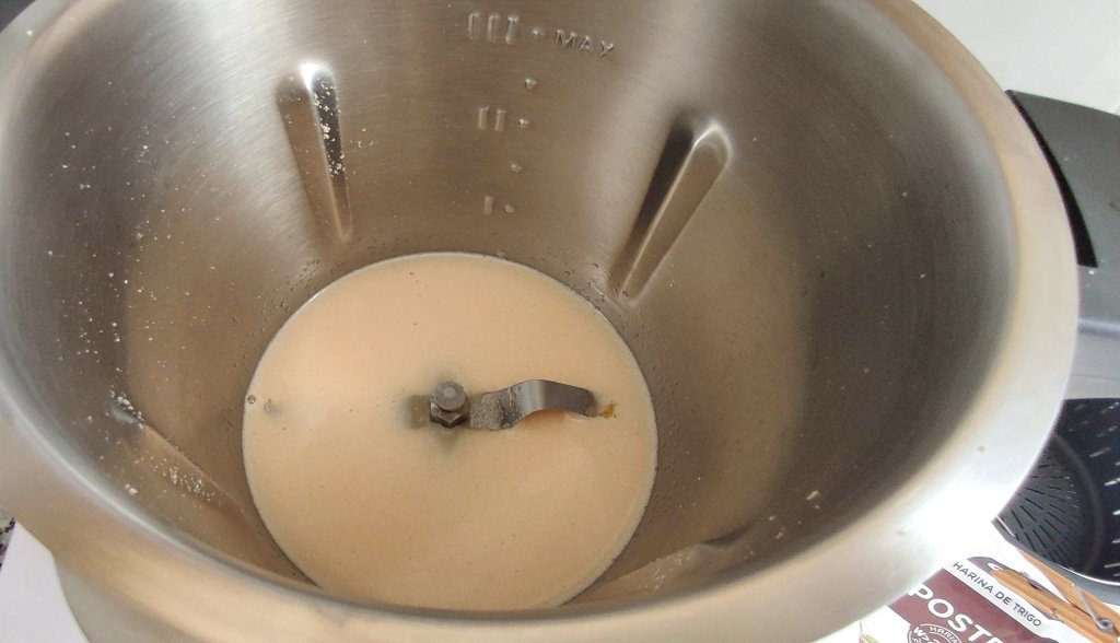 Volver a programar 3 minutos vel. 3 e ir incorporando de uno en uno los 4 huevos (temperatura ambiente) y una pizca de sal.