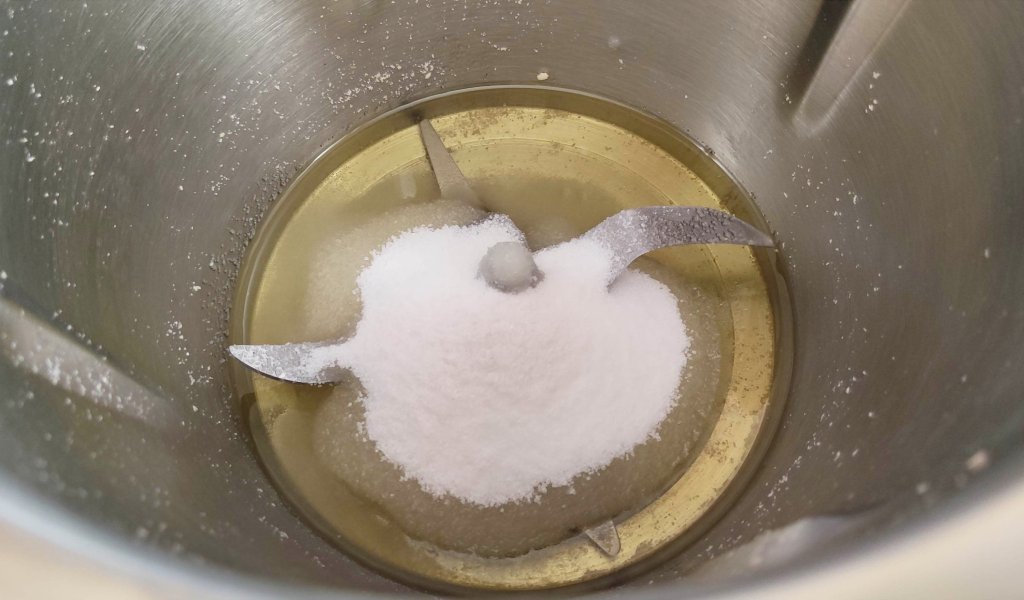 Poner en el vaso 150 gr de aceite y los 140 gr de azúcar (reserva 10 gr aproximadamente para adornar antes de hornear)