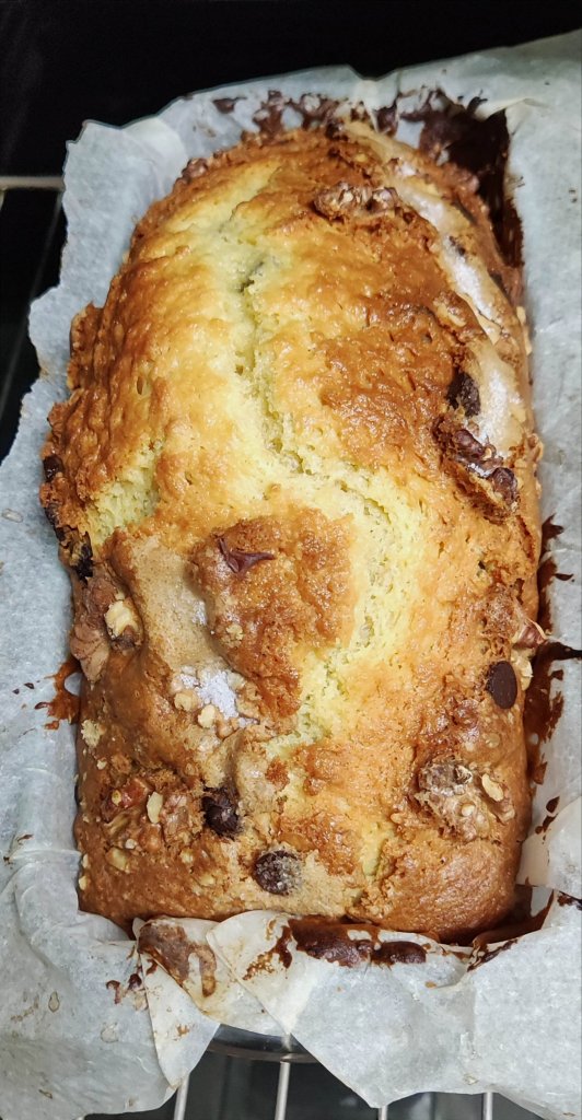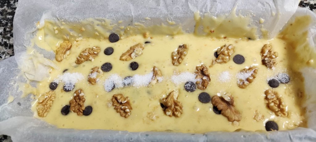 Para esta ocasión lo he adornado con unas cuantos nueces. Con los 10 gr de azúcar sobrantes decora el centro de la masa.