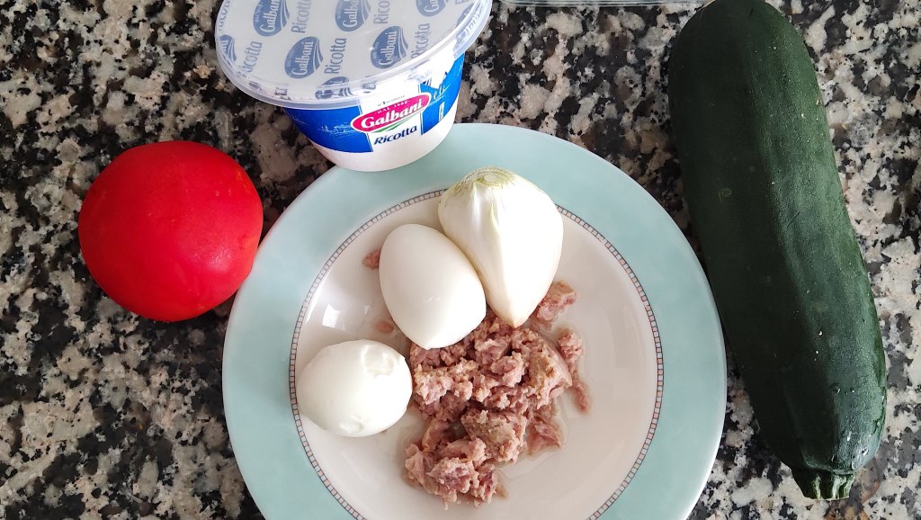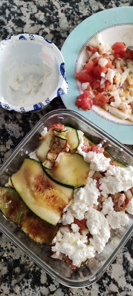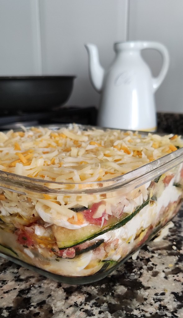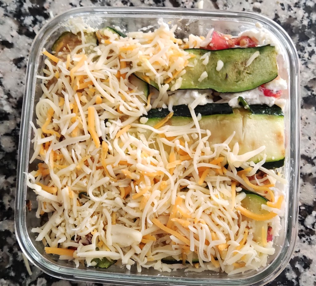 En un recipiente de vidrio que puedas meter en horno o microondas, empezamos a colocar las capas. La primera de calabacín, otra de la mezcla y la ricotta. Repetir varias capas.