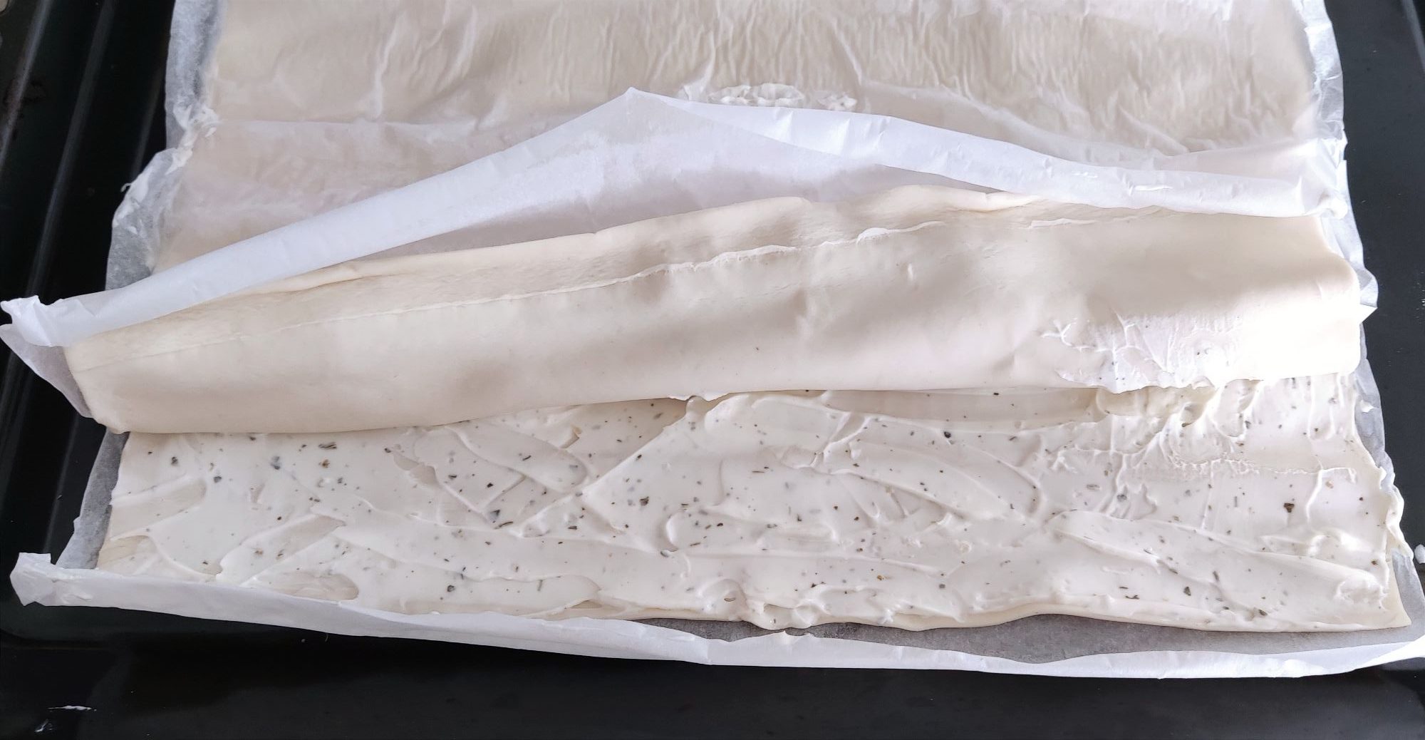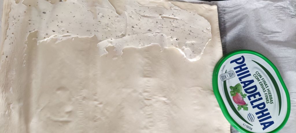 Extiende la masa de hojaldre y unta la base con el queso filadelfia.
