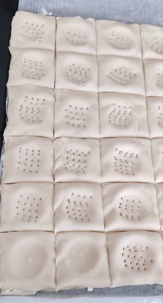 Coloca encima con cuidado la otra masa de hojaldre y con un cuchillo afilado señala los cuadraditos. (para la medida yo he utilizado un trozo de cartón del emboltorio para marcar las líneas)