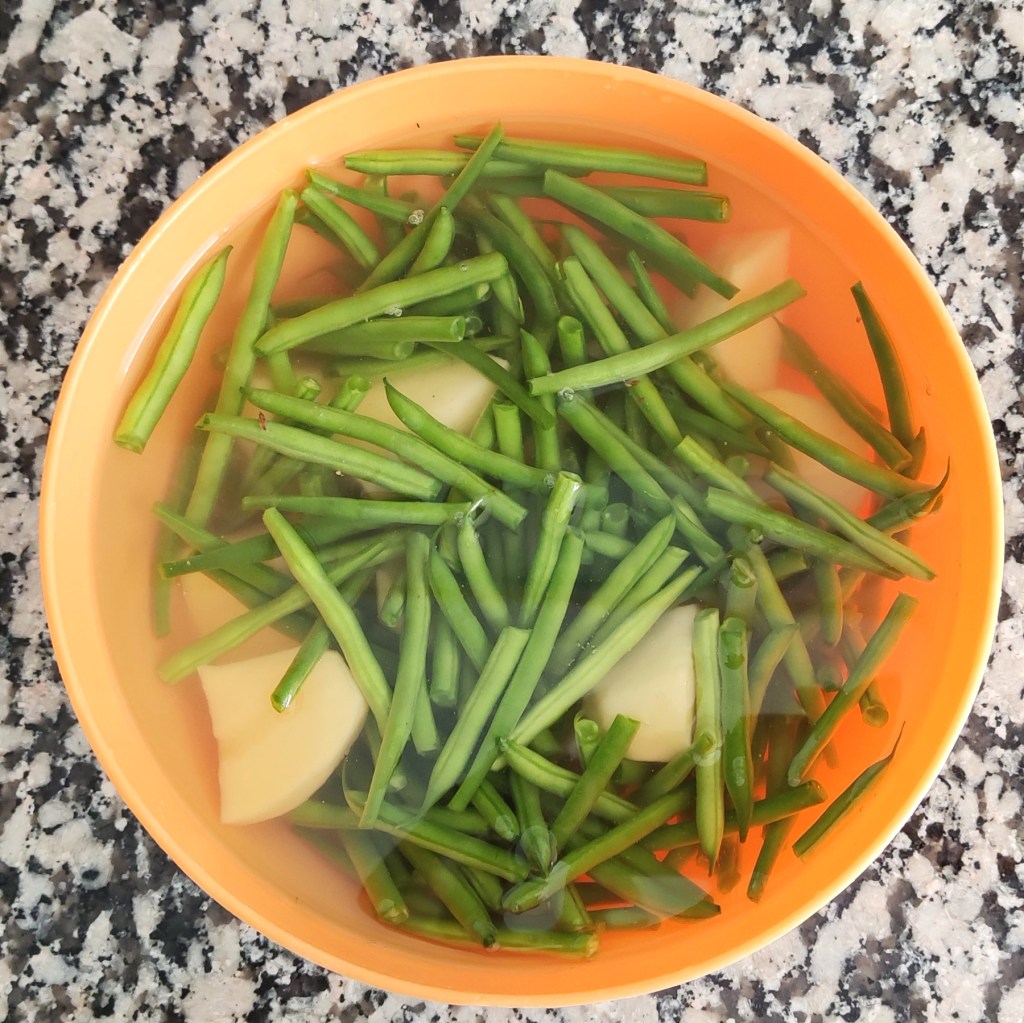 Troceamos las judías y quitamos el rabito. Pelamos y troceamos las patatas.